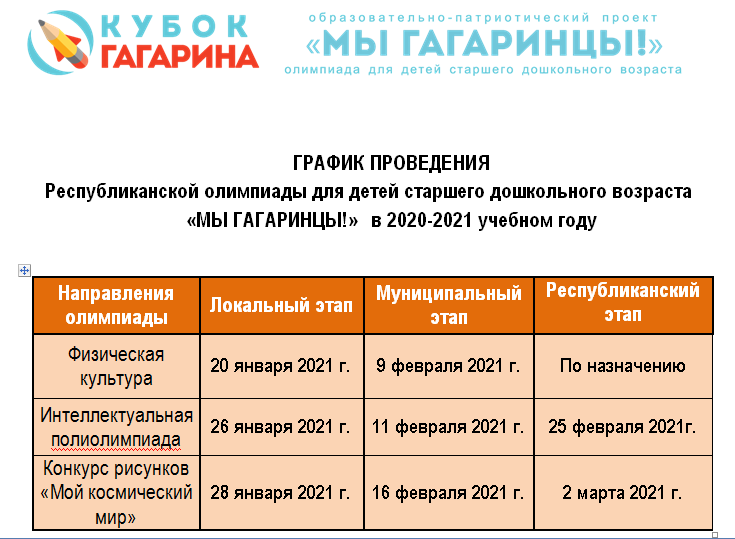 График проведения Республиканской олимпиады для детей старшего дошкольного возраста "Мы Гагаринцы!" в 2020-2021 учебном году.