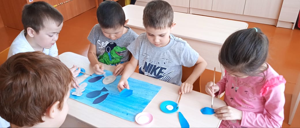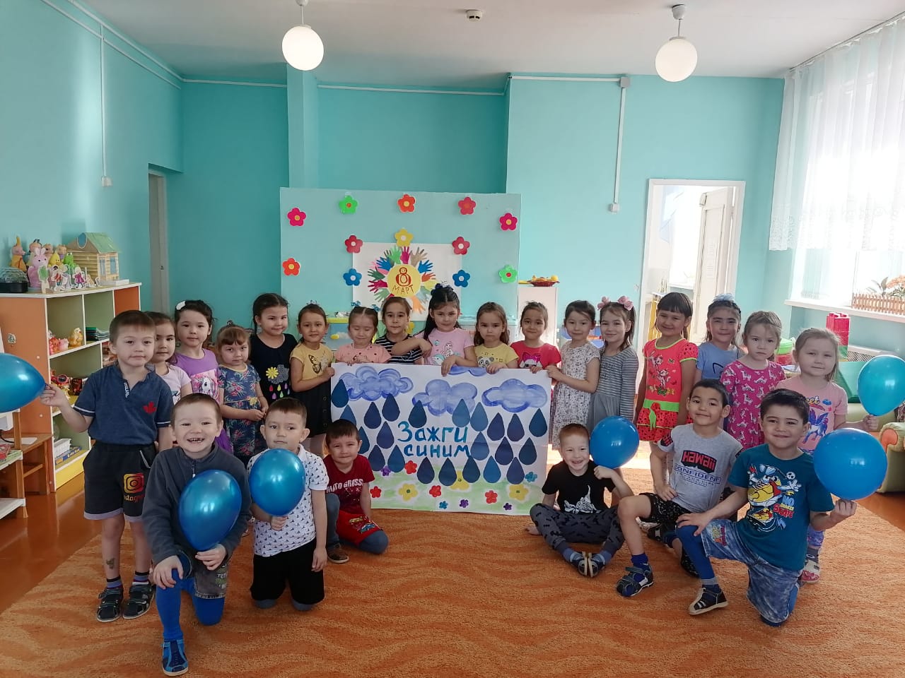 Воспитанники выполняли коллективные работы «Зажги синим», вырезали ладошки, шарики, капельки и сердца из цветной бумаги синего цвета.